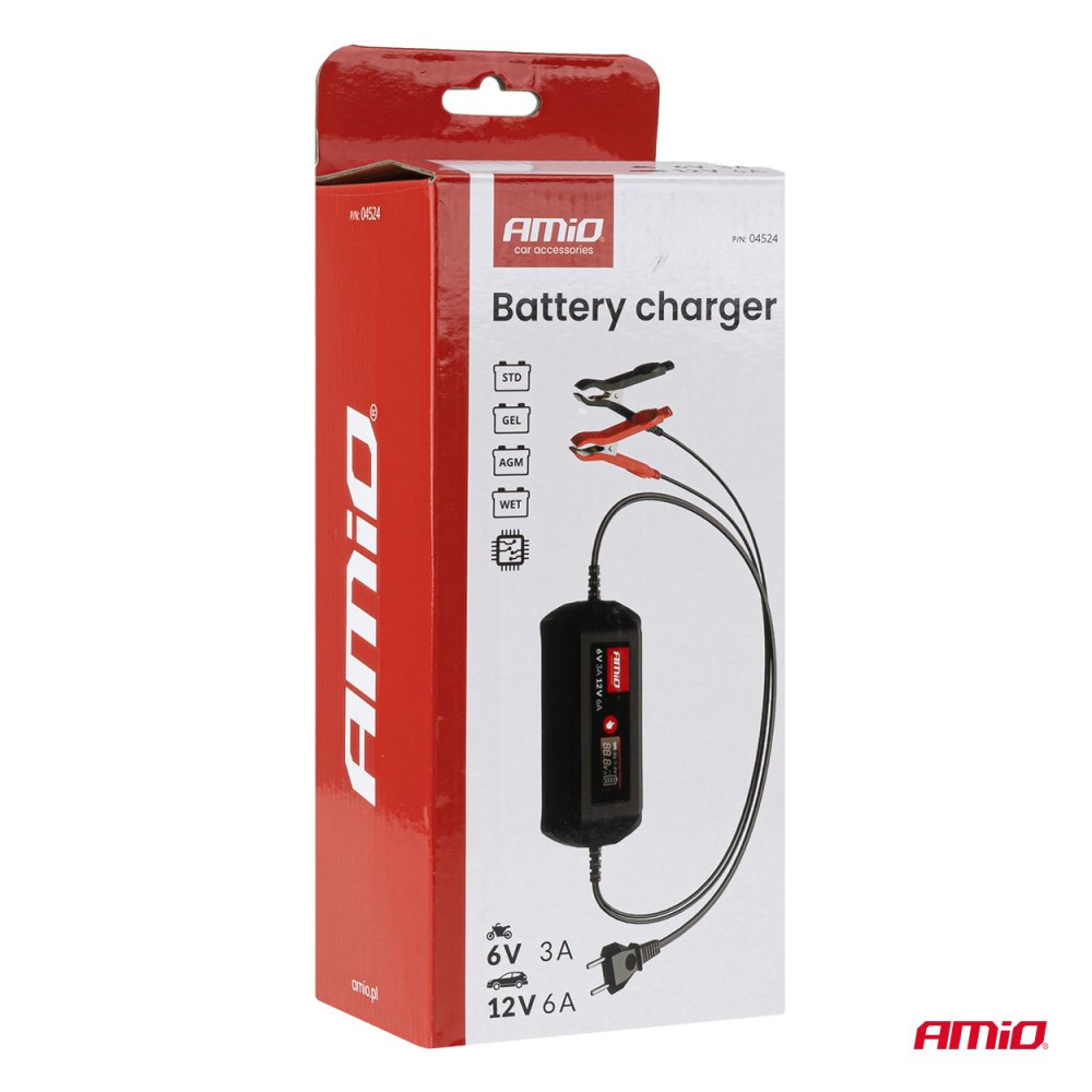 Digitální nabíječka AMiO je moderní zařízení pro nabíjení olověných baterií: WET, AGM a GEL. Díky stabilnímu a přesnému nabíjení s maximálním proudem 6 A zajišťuje rychlé, bezpečné a efektivní dobíjení 6V nebo 12V baterií. Tato základní nabíječka je vybavena funkcí udržování napětí a automatickou regenerací sulfátovaných baterií. Je ideální pro nabíjení motocyklových baterií a osobních automobilů s benzínovými a naftovými motory malého objemu. 6 univerzálních nabíjecích programů (STD, GEL, AGM, WET)