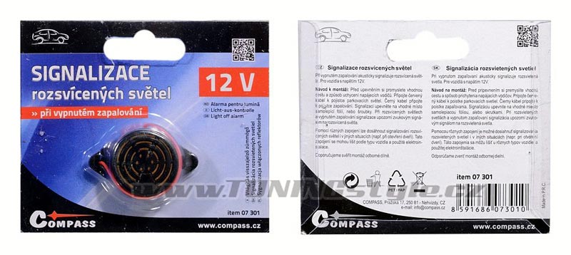Při vypnutí zapalování, nebo při otevření dveří automobilu akusticky signalizuje nevypnuté světla vozidla. Ideální ochrana proti nechtěnému vybití akumulátoru. Připevnění přilepením, nebo přišroubováním.