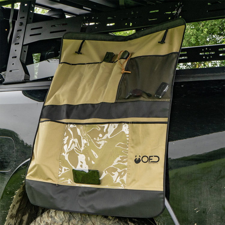 Keeps items organised and protected5 slim pockets2 wide pockets1 mesh pocket1 transparent pocketExtra pocket on the back, as big as whole bagEasy accessEasy to clean, hard to rip materialAttaches easily to most roof top tents by sliding o-rings into t-slotsAttaches easily to most surfaces thanks to included carabiners2x O-ring for t-slots in tent's frame Celý popis